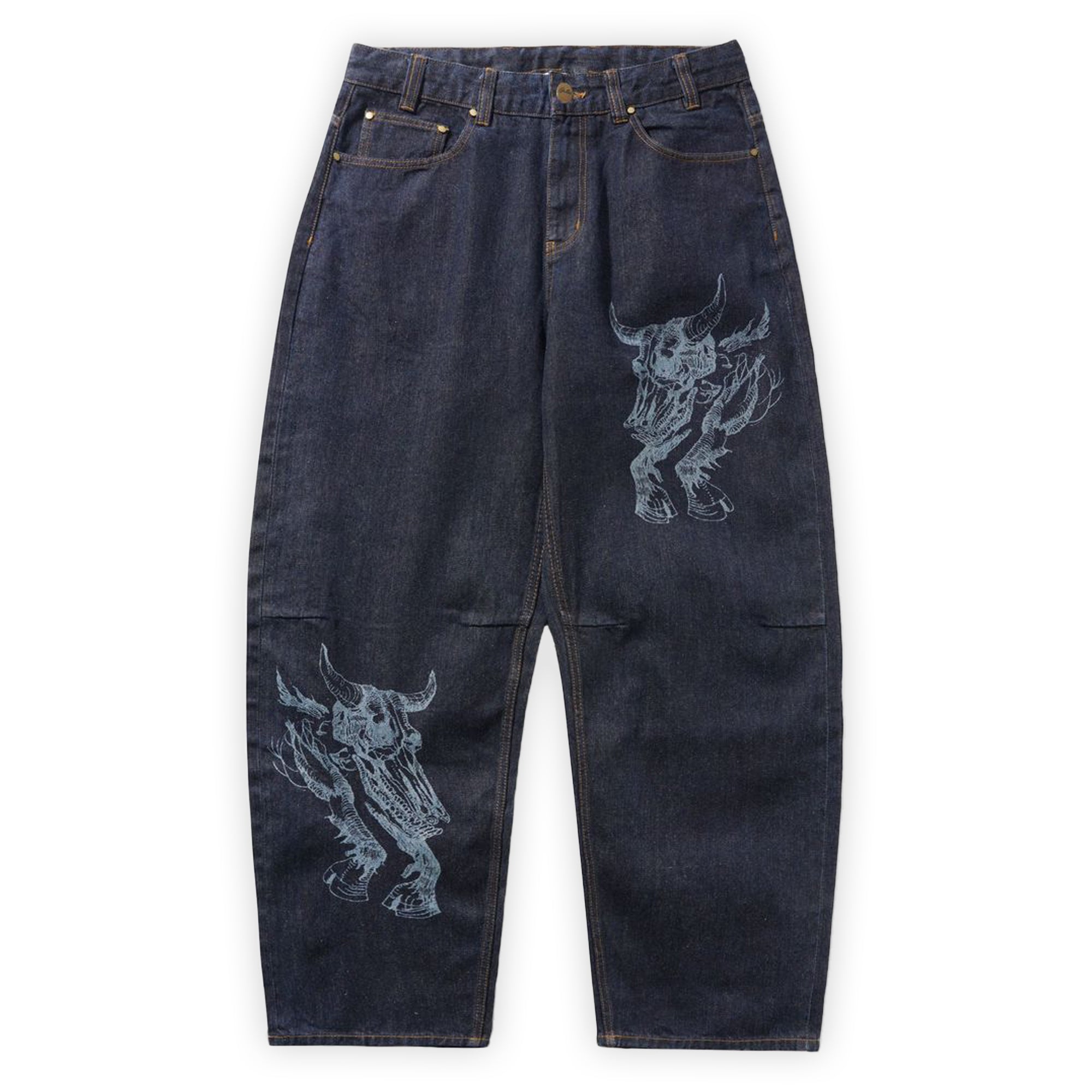 Introducing Perth based brand Butter Goods and their collaboration with Daniel Johnston to Pass~Port Store & Gallery. 100% Cotton wide cut denim jeans featuring laser etched graphic on front, woven label & embroidery on back pocket. The Bull Selvedge Denim Jeans also feature darts at knee and belt loops with internal drawstring.