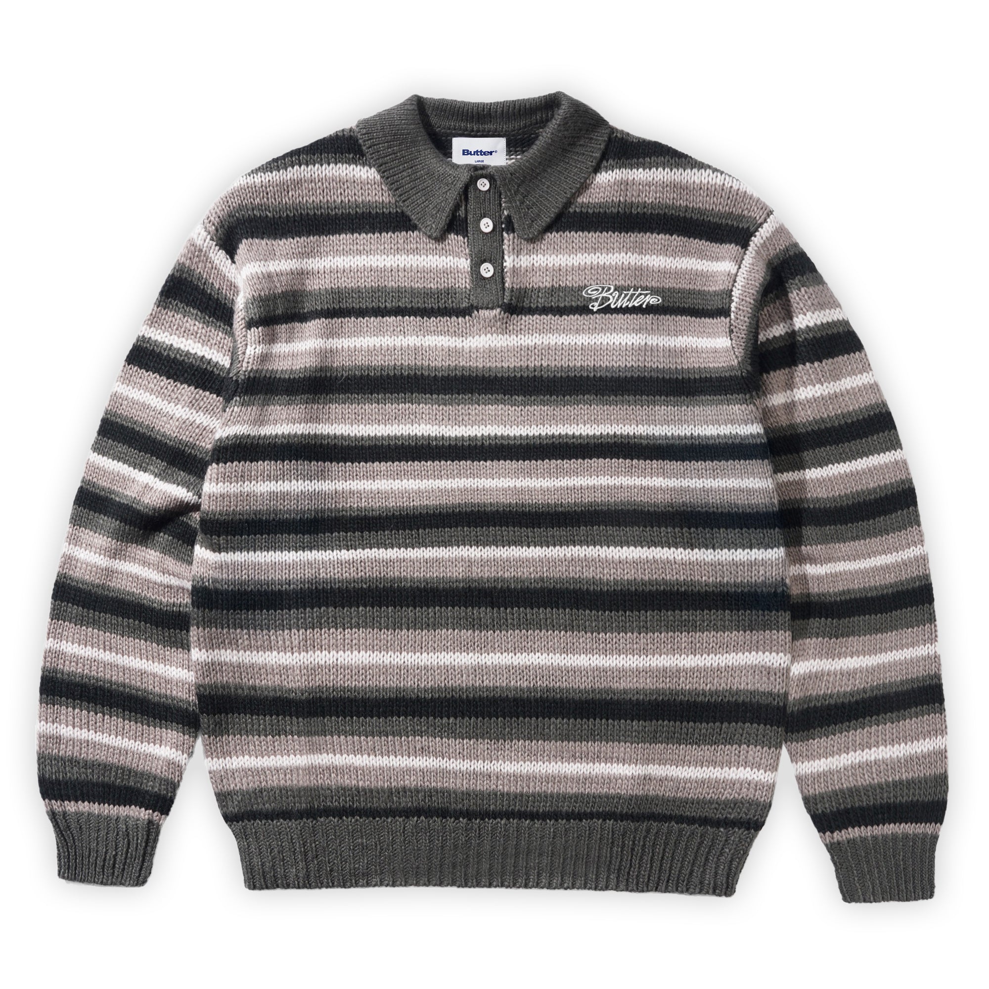 Introducing Perth based brand Butter Goods to Pass~Port Store & Gallery. The Ombre Stripe Knit Sweater is made from 100% Acrylic and features 3 button closure and collar, stripe knit design and a small embroidery detailing on the left chest.