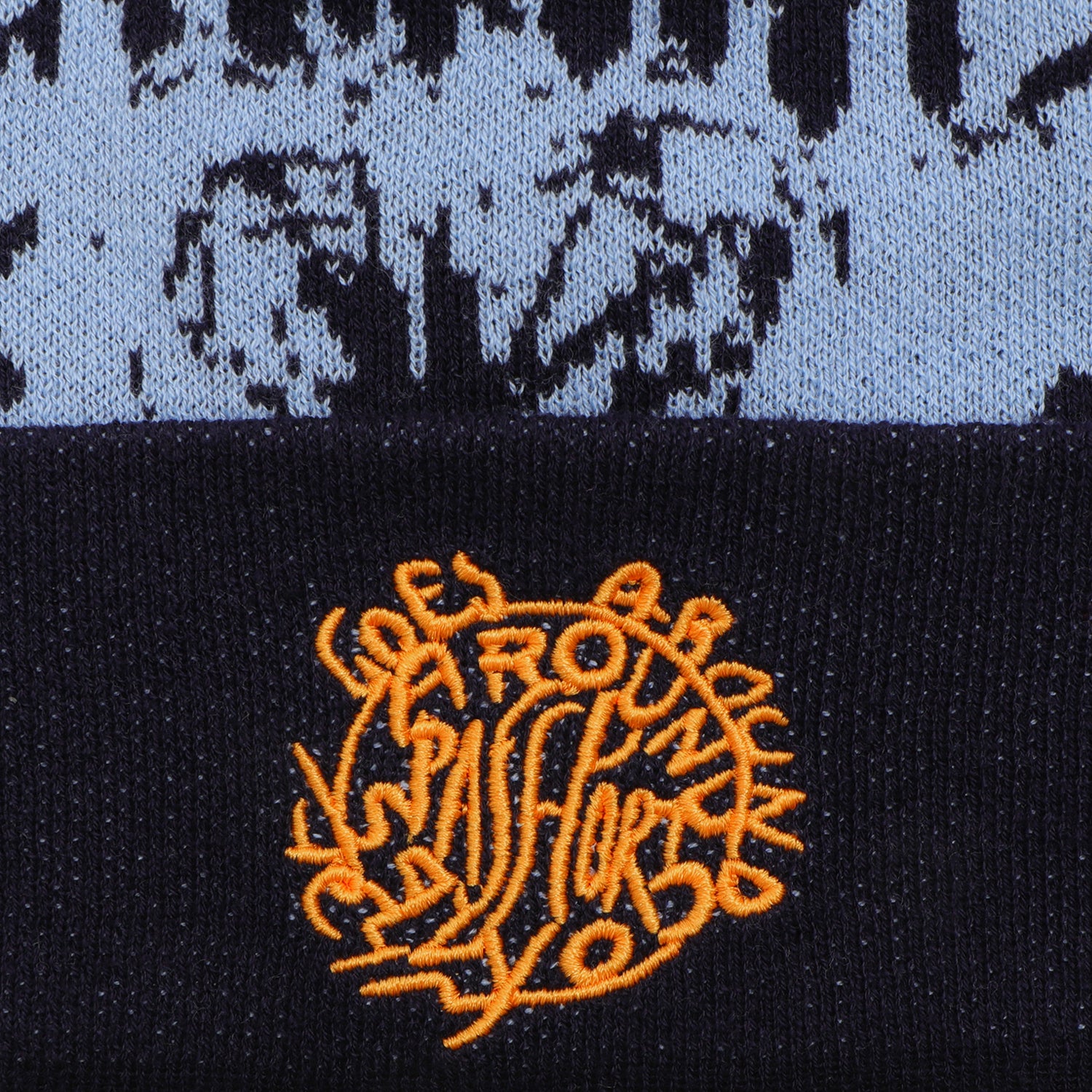 Pass~Port Goes Around Beanie in Navy from range #47. The Pass~Port beanie is made from 100% cotton yarn with a direct embroidered front and an all over jacquard pattern.