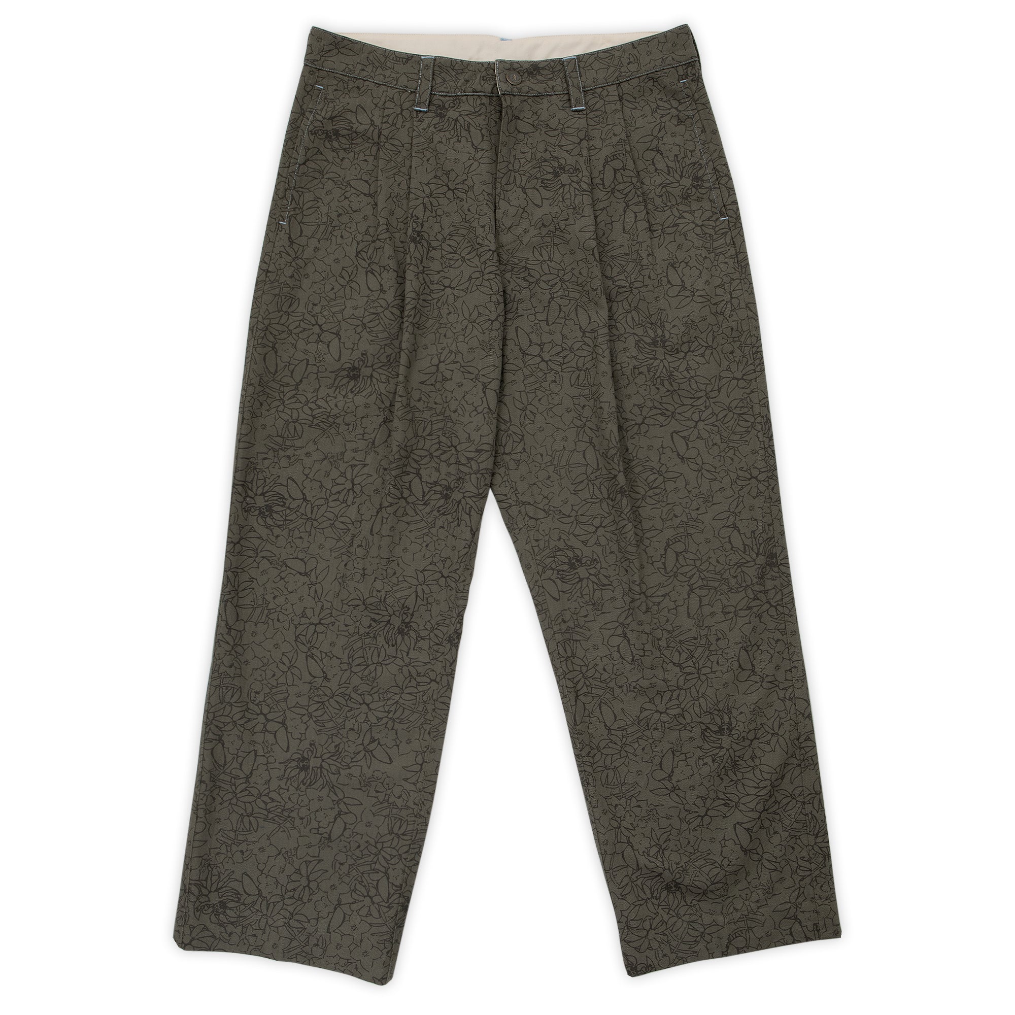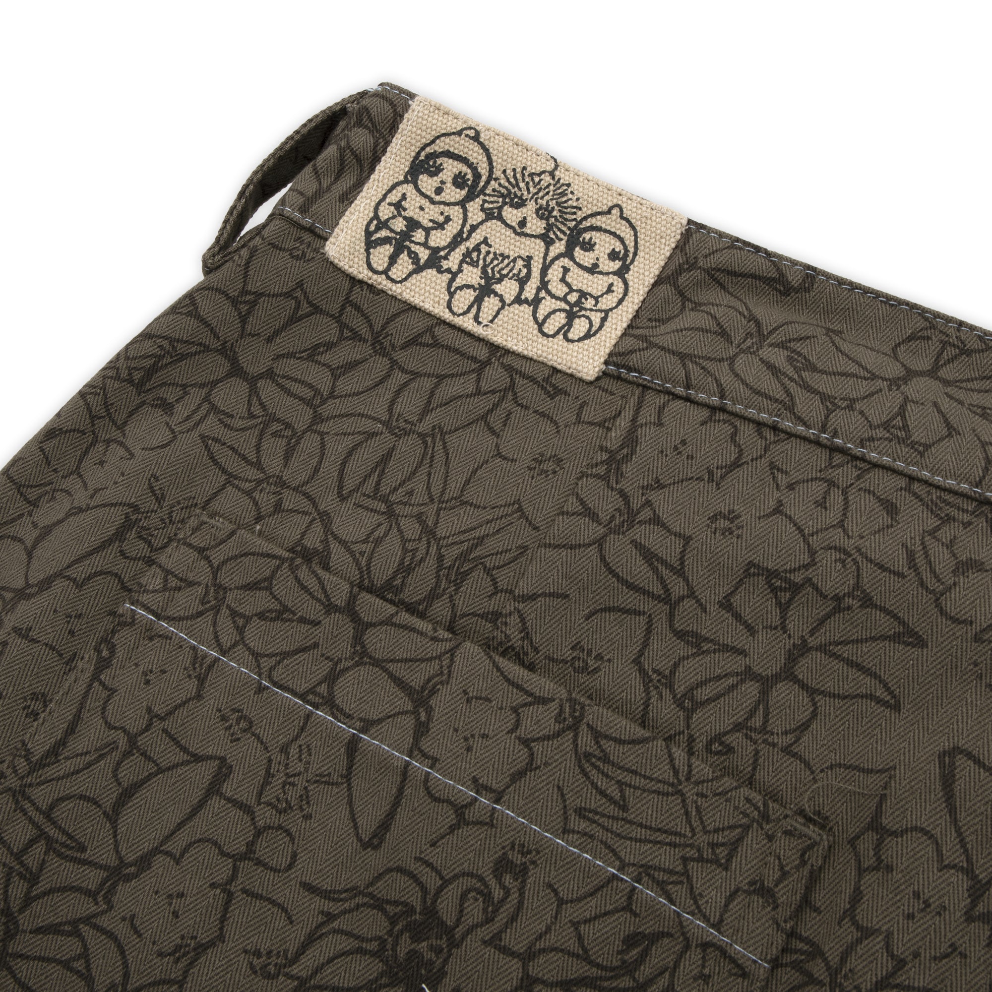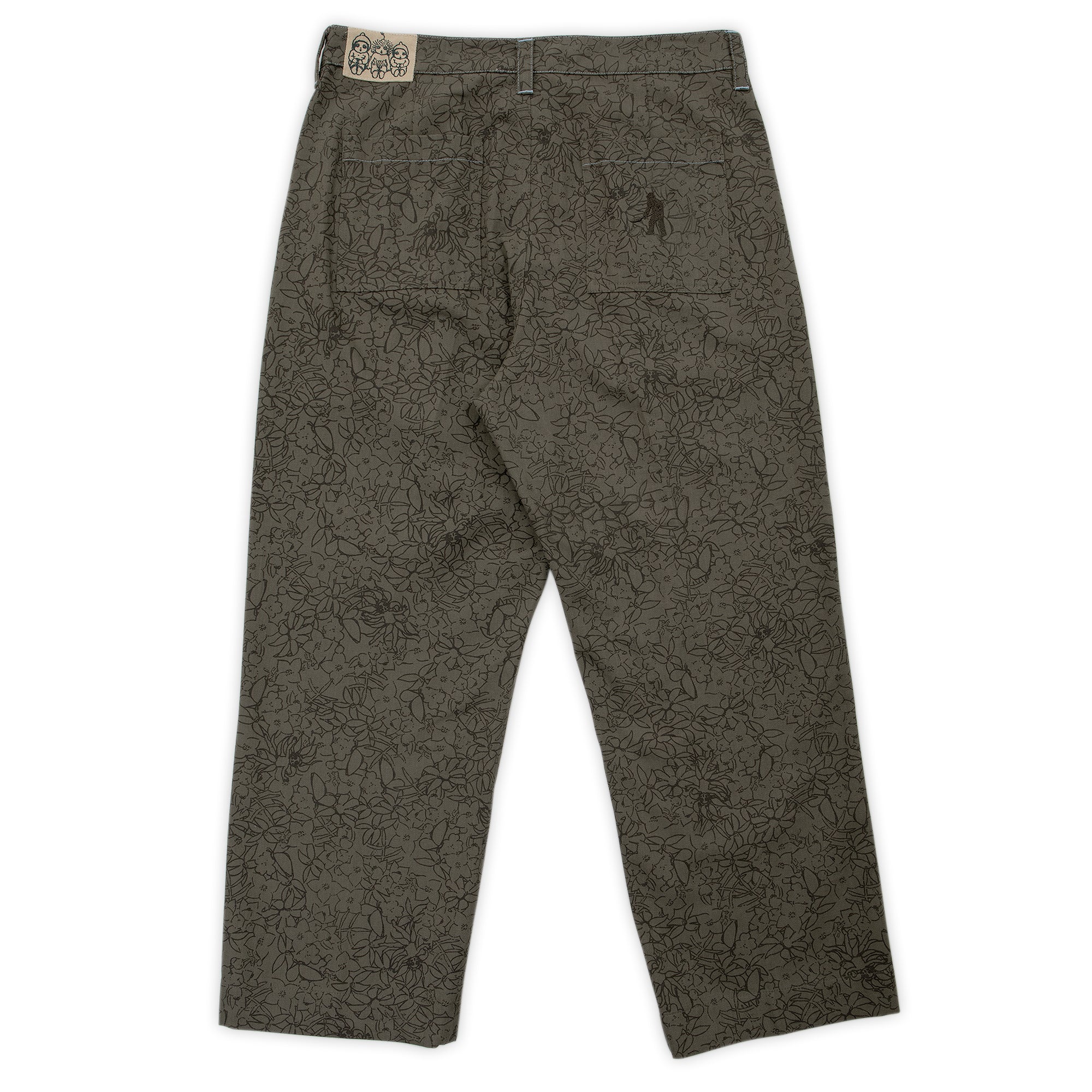 The Scribblegum Leagues Club Pant in Olive are made from 100% cotton herringbone and features double pleats, custom button, canvas rear patch, waistband embroidery and finished in an all over print.