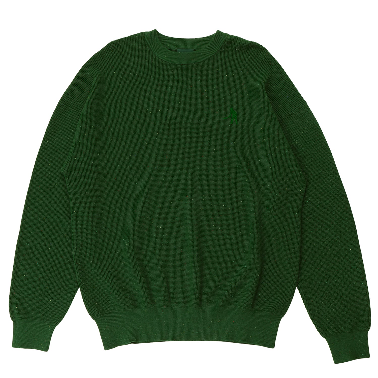 Pass~Port Speckle Knit Sweater in Forest Green from the organic line for range #47. This sweater is a midweight knit made from 100% organic cotton and features speckle waffle knit with direct embroidery detailing and saddle shoulders.