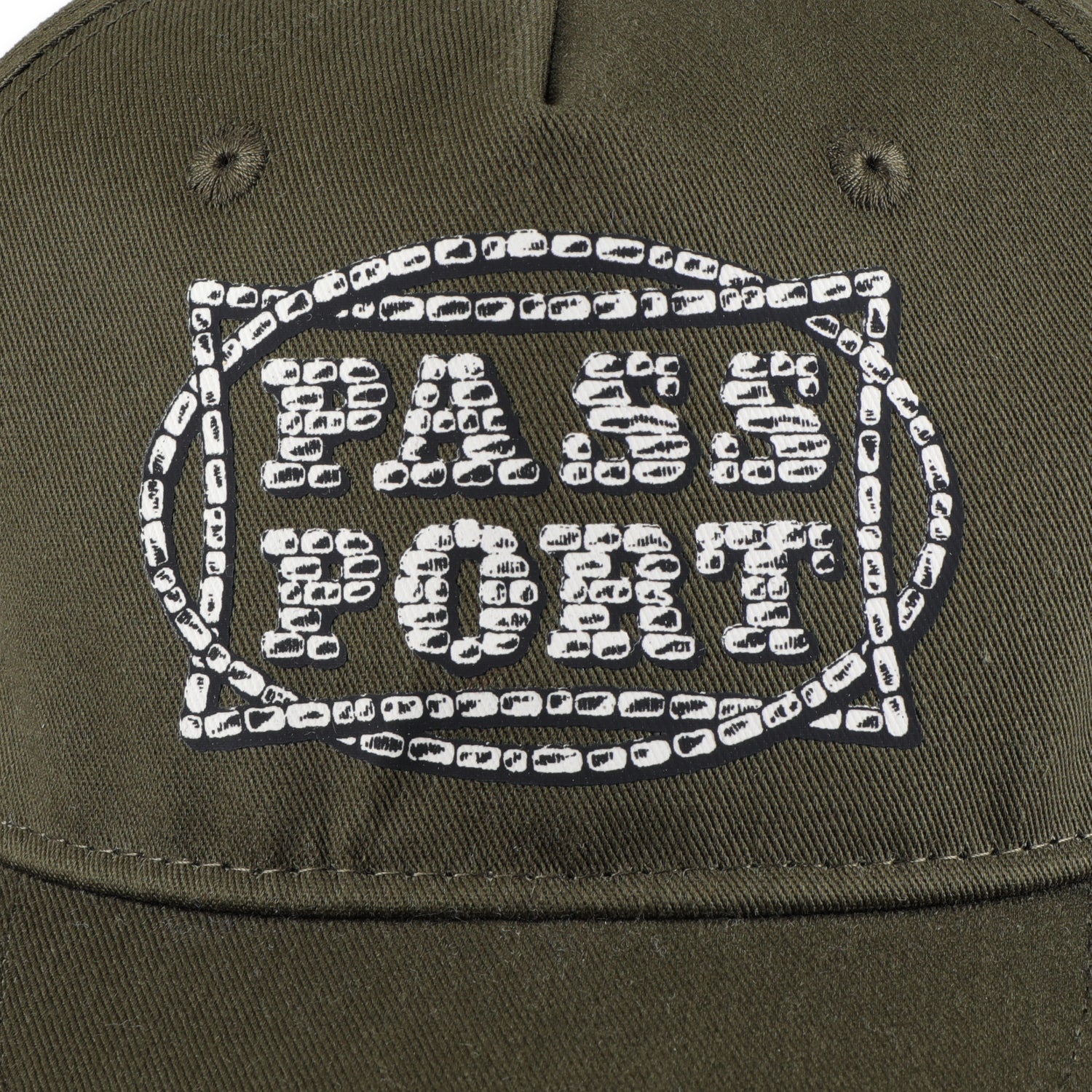 Pass~Port Stone Circle Workers Cap in Olive from range #47. The Pass~Port workers cap is a 5 panel hat made from 100% cotton twill and features screen printed front detailing with adjustable strap back with brass buckle.