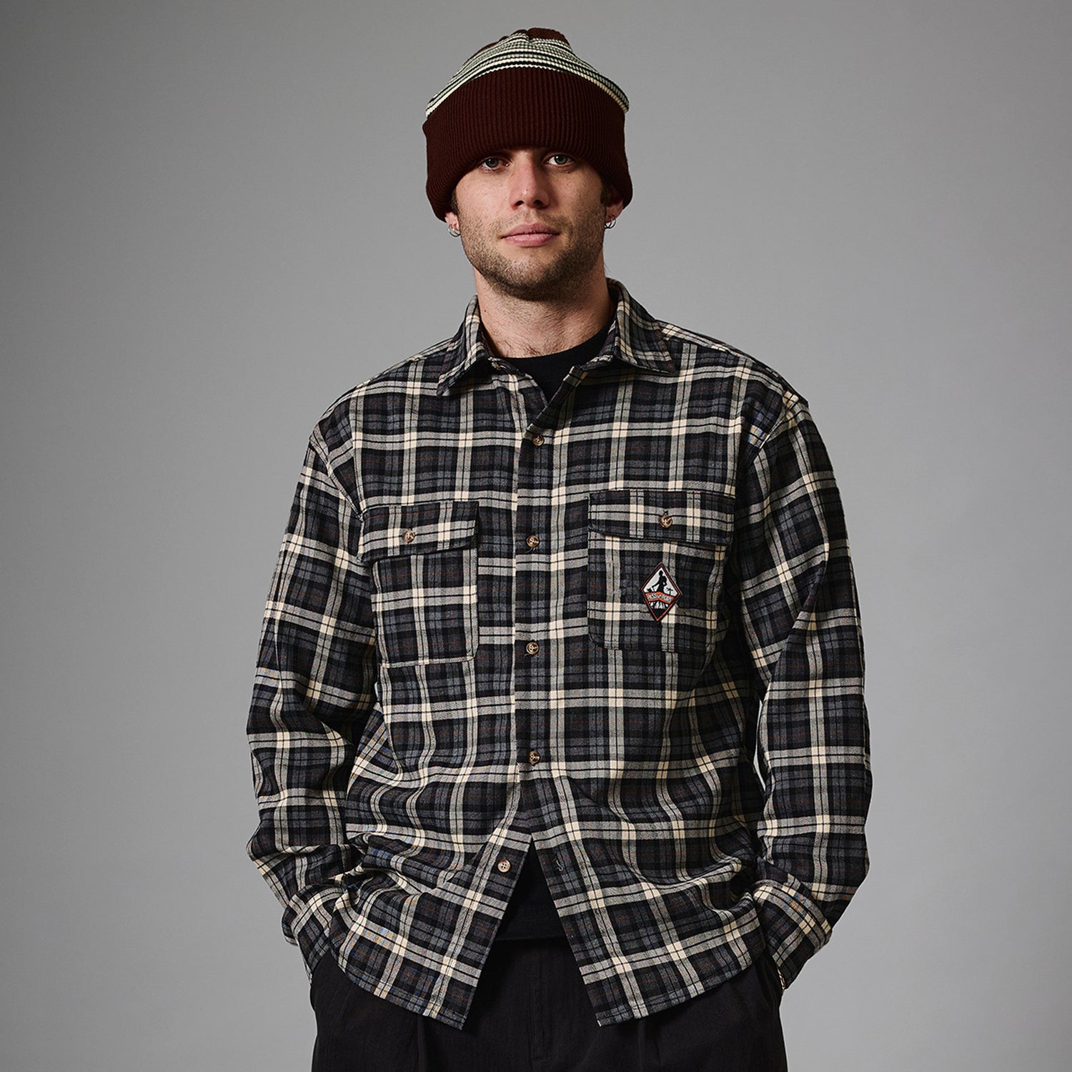 Pass~Port Wanderer Flannel Vineyard Shirt in Black from range #46. This long sleeve button up shirt is made from Poly blend and features two pockets on front chest, a woven label, recycled buttons & digger pip.