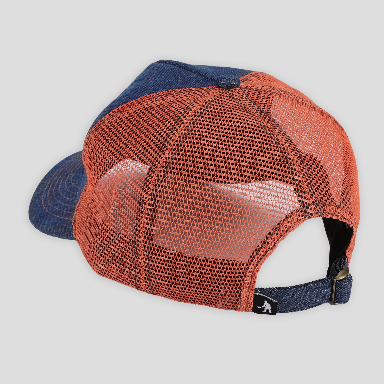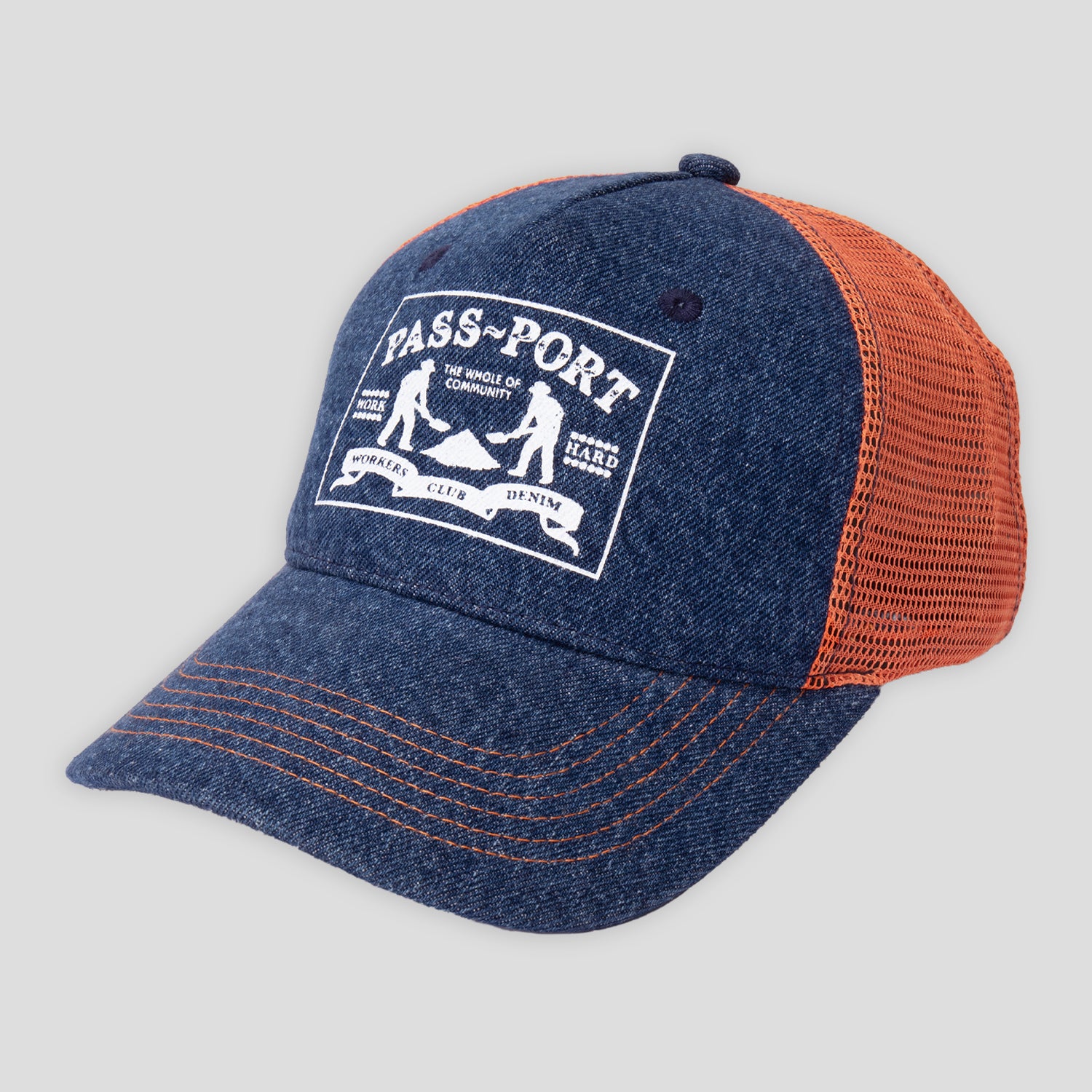 Pass~Port Workers Club Denim Packers Trucker from range #44. The Packers trucker cap is a 5 panel cap with 16oz workers denim front and RPET mesh back. The cap features a screen print on front and adjustable strap back with brass buckle.