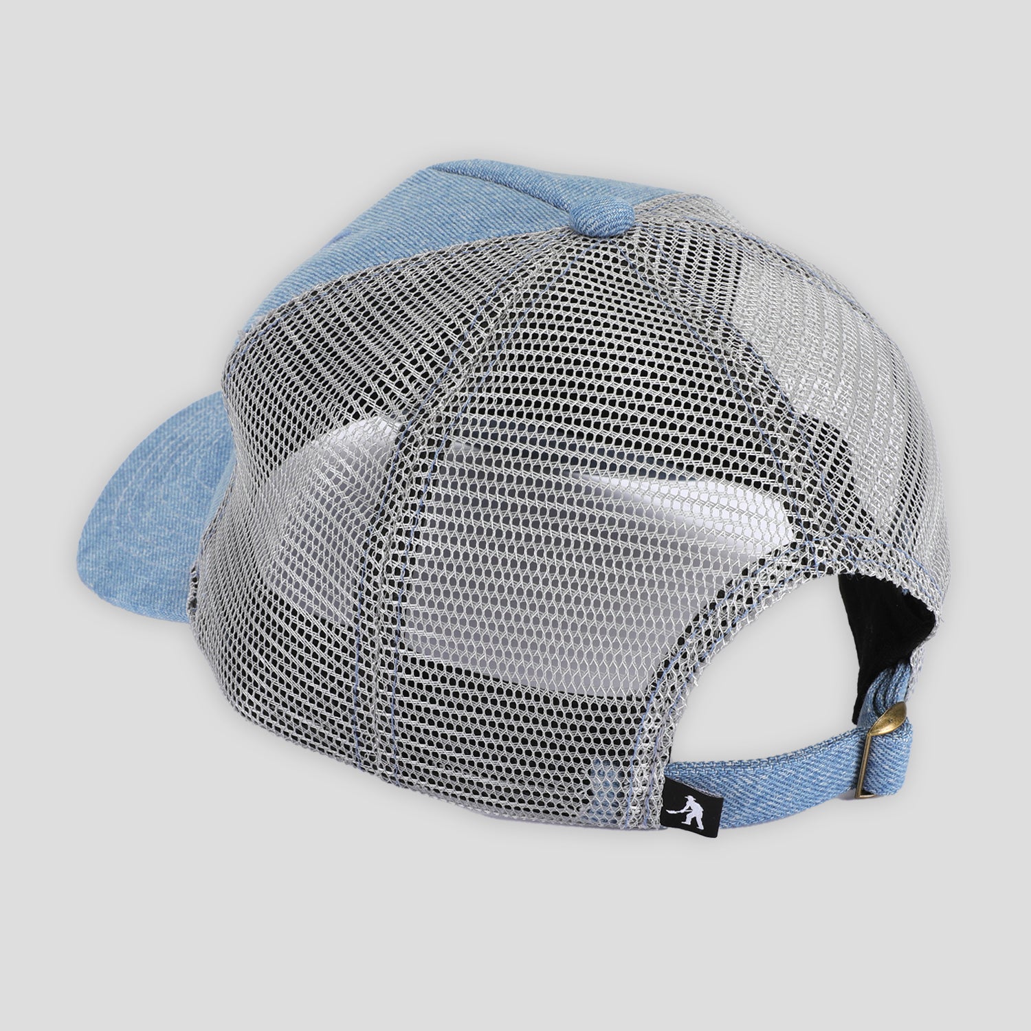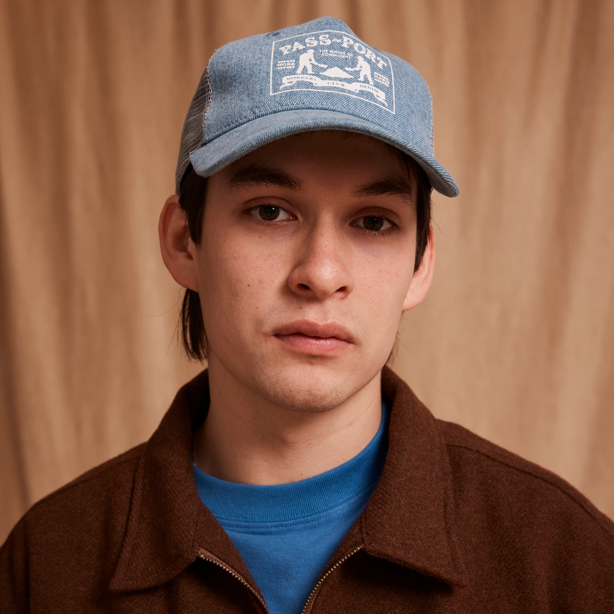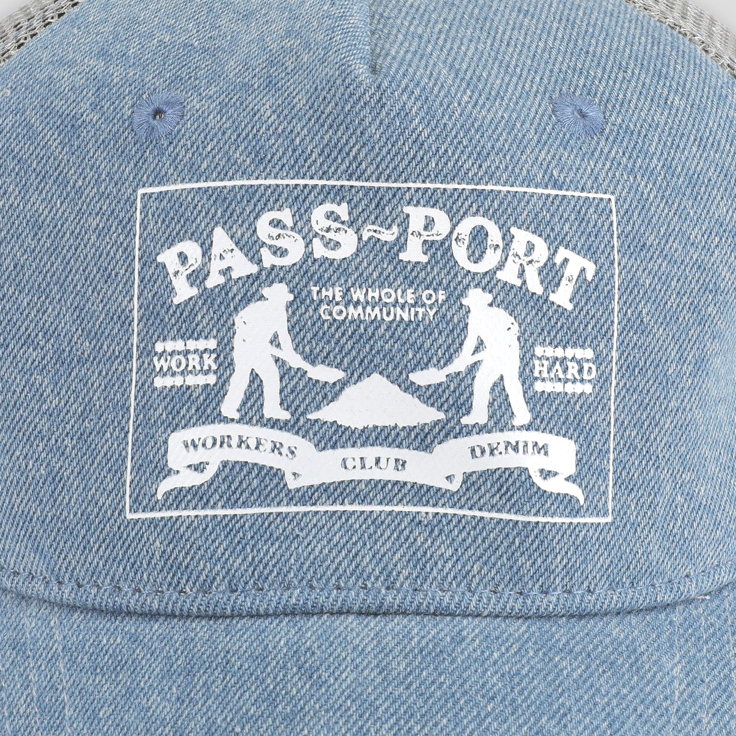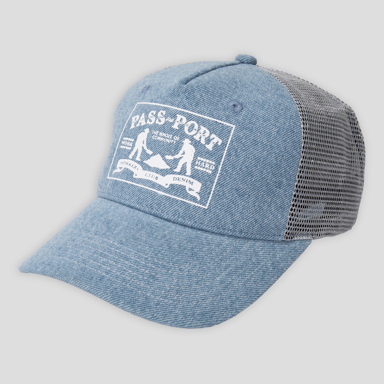 Pass~Port Workers Club Denim Packers Trucker from range #44. The Packers trucker cap is a 5 panel cap with 16oz workers denim front and RPET mesh back. The cap features a screen print on front and adjustable strap back with brass buckle.