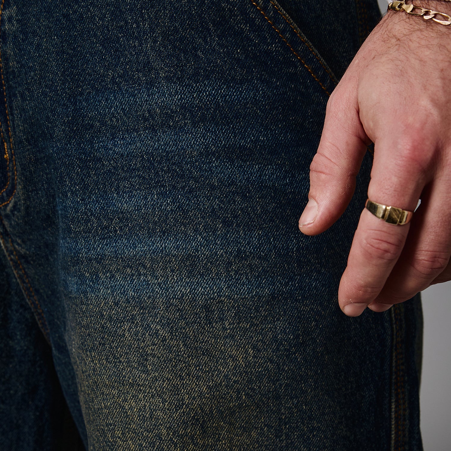 Pass~Port Workers Club denim short in faded washed dark indigo from range #46. The Workers denim short is made from 100% cotton 16oz rigid denim and fine yarn for extra strength. The denim short features silver contrast stitching, digger embroidery on back pocket as well a faux leather label on waist.